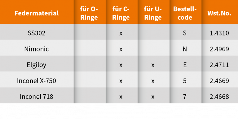 Für die Fertigung der Ringe und Federn stehen unterschiedliche Edelstähle und Nickellegierungen zur Verfügung. Die Auswahl des am besten geeigneten Materials richtet sich nach Anwendung und Spezifikation.