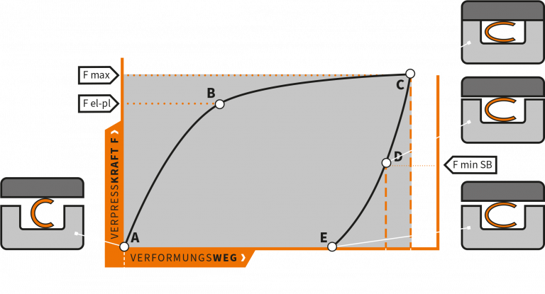 Durch Verpressung des Dichtelementes vom ursprünglichen Querschnitt (A) auf die erforderliche Nuttiefe (C) wird die maximale Presskraft (F max) generiert. Hierbei wird der Ring nicht nur elastisch (A-B), sondern auch plastisch (B-C) verformt. Die Presskraft sorgt bei beschichteten Ringen zudem für ein Fliesen der Beschichtung. Mikroskopisch kleine Unebenheiten in der Gegendichtfläche der Nut werden durch diesen Mechanismus verschlossen und geringste Leckageraten sichergestellt. Elastische Metalldichtungen haben bei Entlastung die Fähigkeit definiert zurückzufedern (C-E). Dieses Verhalten ist auch als sog. Springback SB bekannt. Die nutzbare elastische Rückfederung (C-D) stellt sicher, dass bei Auftreten von Flanschabhebungen in Folge von Druck- und Temperaturbeaufschlagung, die Dichtigkeit gewahrt bleibt. Um die Dichtperformance aufrechtzuerhalten, ist i.d.R. nur ein Teil des gesamt SB nutzbar, sodass die Dichtkraft F min SB nicht unterschritten wird.