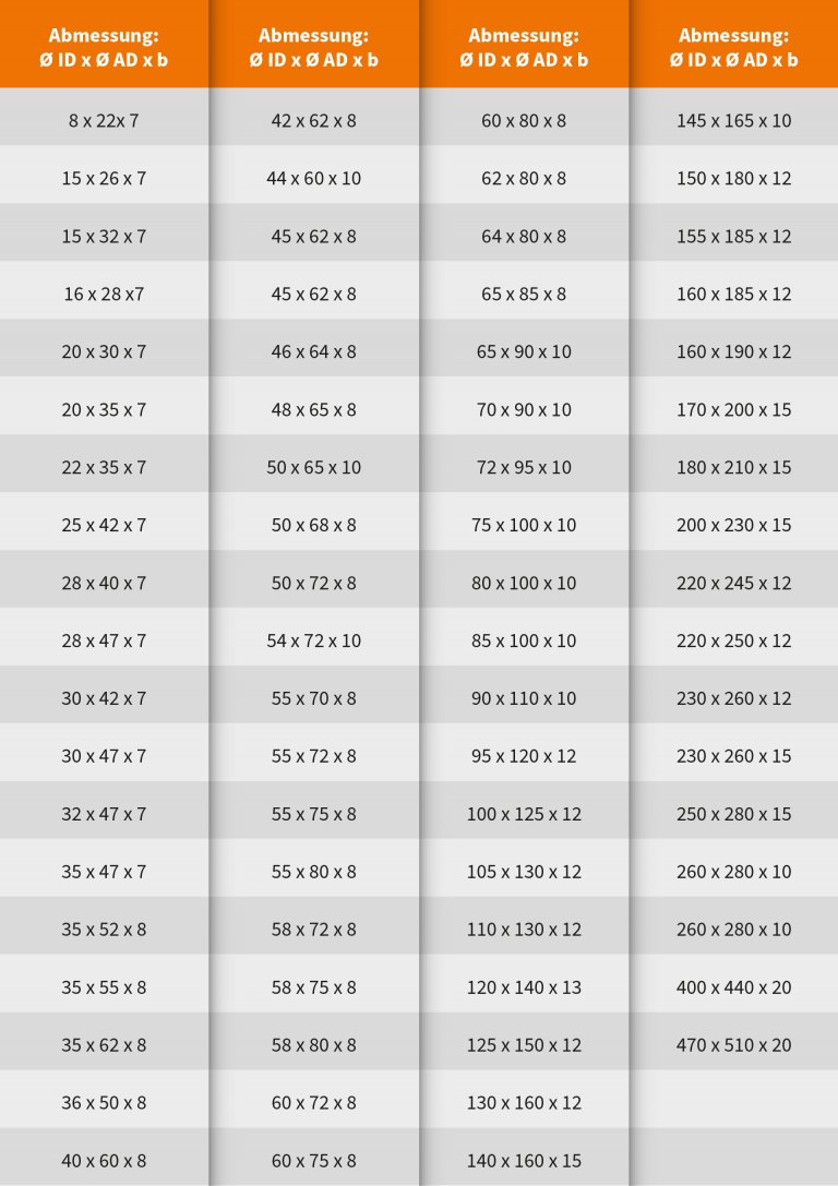 Viele gängigen Abmessungen des Standardtyps M01 werden von uns bevorratet. Darüber hinaus fertigen wir diese Ringe in beliebigen Zwischenmaßen.